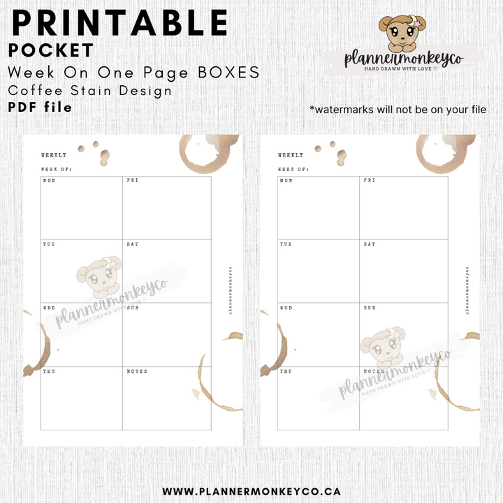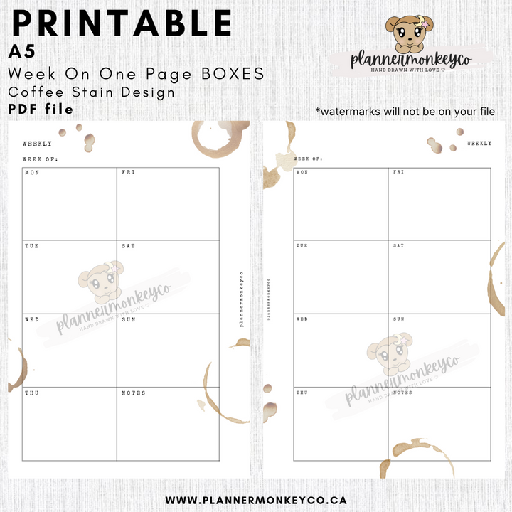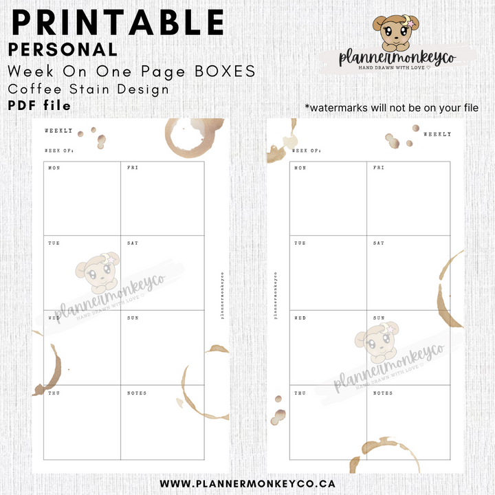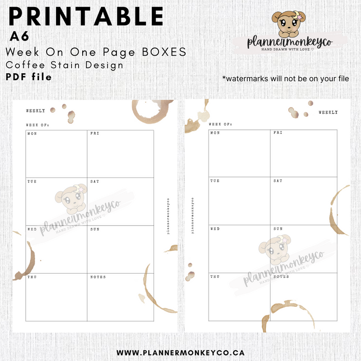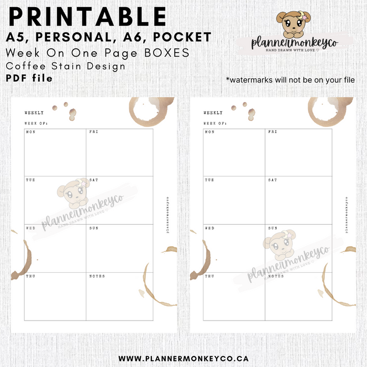 Coffee Stain Week On 1 Page Box Layout Printable PDF | Pocket, A6, Personal, A5